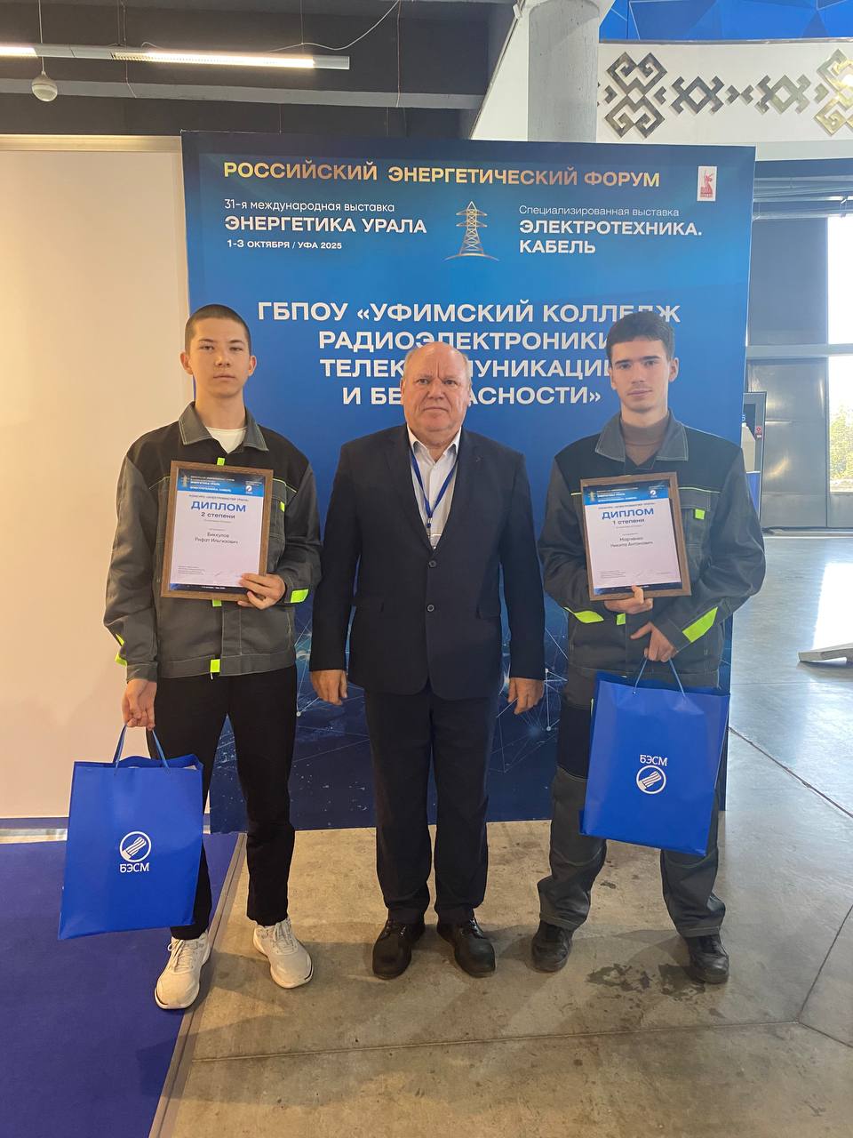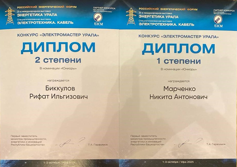1 октября 2025 года в г. В рамках XXV Российского энергетического форума и 31-й международной выставке «Энергетика Урала» команда группы 9ЭСС-2К-24 в составе студентов: Биккулова Рифата, Марченко Никиты, Янчевского Никиты соревновались в конкурсе электромонтажников «ЭЛЕКТРОМАСТЕР УРАЛА» в номинации – ЮНИОРЫ. Команду подготовил преподаватель Рыжиков А. И.